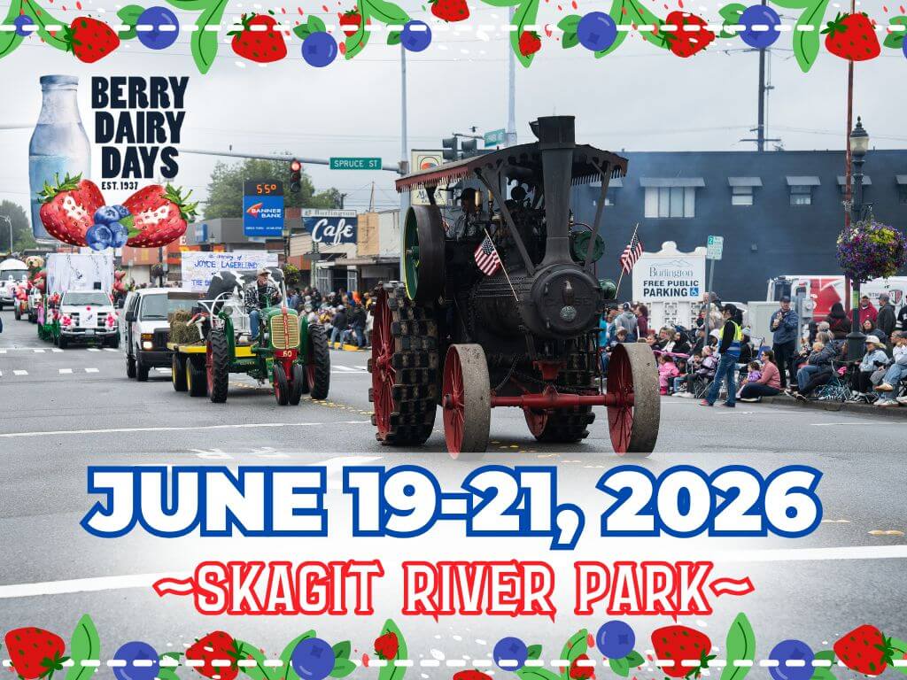 The 89th Berry Dairy Days Festival returns to Burlington, Washington, June 19–21, 2026, at Skagit River Park for three days of free, family-friendly fun. The festival kicks off Friday, June 19, from 4 p.m. until dusk with Festival in the Park, and goes all Father’s Day weekend featuring over 120 artisan, commercial, and food vendors, Free Kid & Teen Zones, Live Entertainment & Music, and more. Enjoy favorites like the Strawberry Shortcake Booth, Grand Parade, Beat the Berry Dash, 5K & 10K Runs, Cornhole Tournament, Smoke & Grill BBQ competitions & public sampling, Berry Cool Car Show, and more to come. With food, games, music, and community celebration, Berry Dairy Days highlights local agriculture and summer spirit in one of Skagit County’s most beloved events.