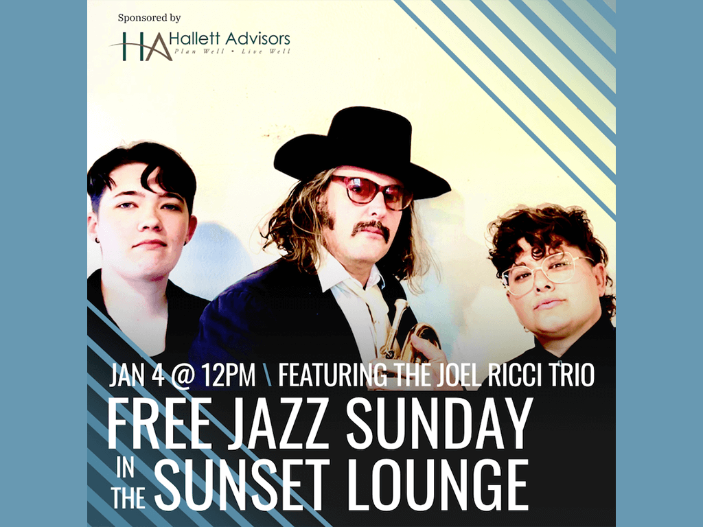 Join us for Free Jazz Sunday in the Sunset Lounge on Sunday, Jan. 4 with the Joel Ricci Trio! The Joel Ricci Trio is plays almost exclusively Ricci’s original jazz compositions written in prototypical “jazz standard” style. The group features local artists Sal Michael on drums and Kendall Melton on electric and stand up bass. Expect original, raw, working-class jazz!
