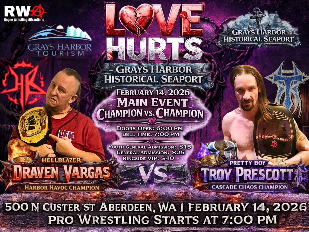Reservations & TicketsExperience the passion and power of live professional wrestling at Love Hurts, presented by Rogue Wrestling Attractions on Feb. 14, at the Grays Harbor Historical Seaport in Aberdeen.