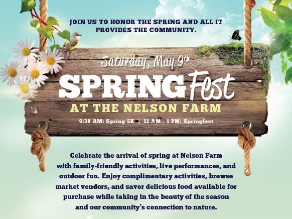 Join us on Saturday, May 9, for Springfest at Nelson Farm! The event will kick off with a 5K run at 9:30 a.m. hosted by Girls with GRIT, followed by the festival from 11 a.m. – 1 p.m. Find full details here.